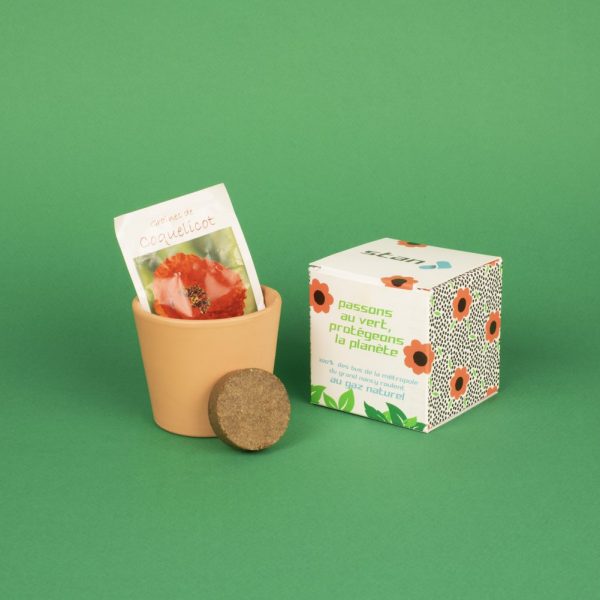 Il comprend tout ce qu’il faut pour faire pousser des fleurs et herbes aromatiques, son emballage en carton recyclé est personnalisable à vos couleurs.