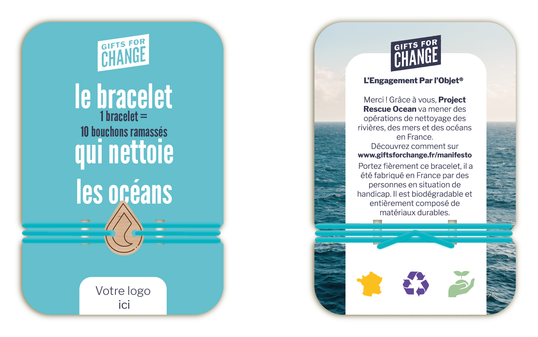 La collection de bracelets Manifesto est clés en main, c’est-à-dire que les designs du médaillon et de la carte sont prêts et le reversement à la cause est déjà établi pour chaque bracelet. Il vous suffit seulement d’ajouter votre logo !