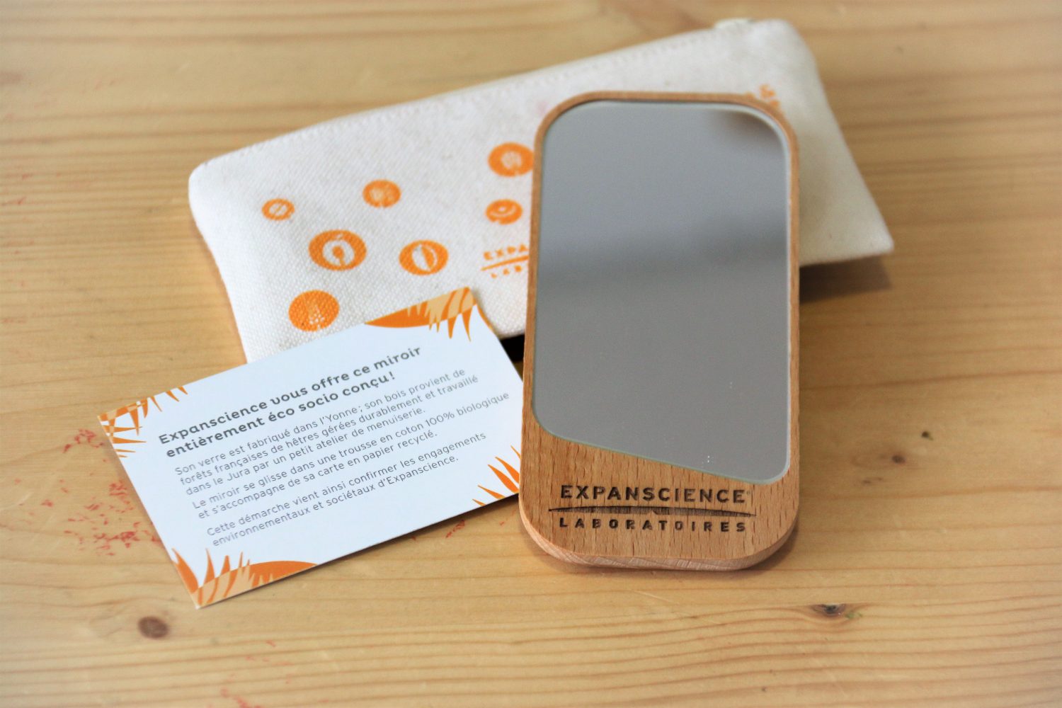 Miroir de poche en bois gravé dans sa trousse sérigraphiée 1couleur en coton Bio, avec carte en papier recyclé imprimée en quadrichromie recto verso