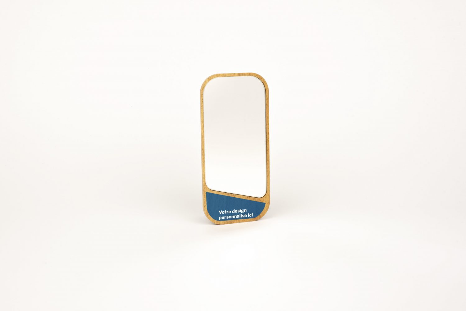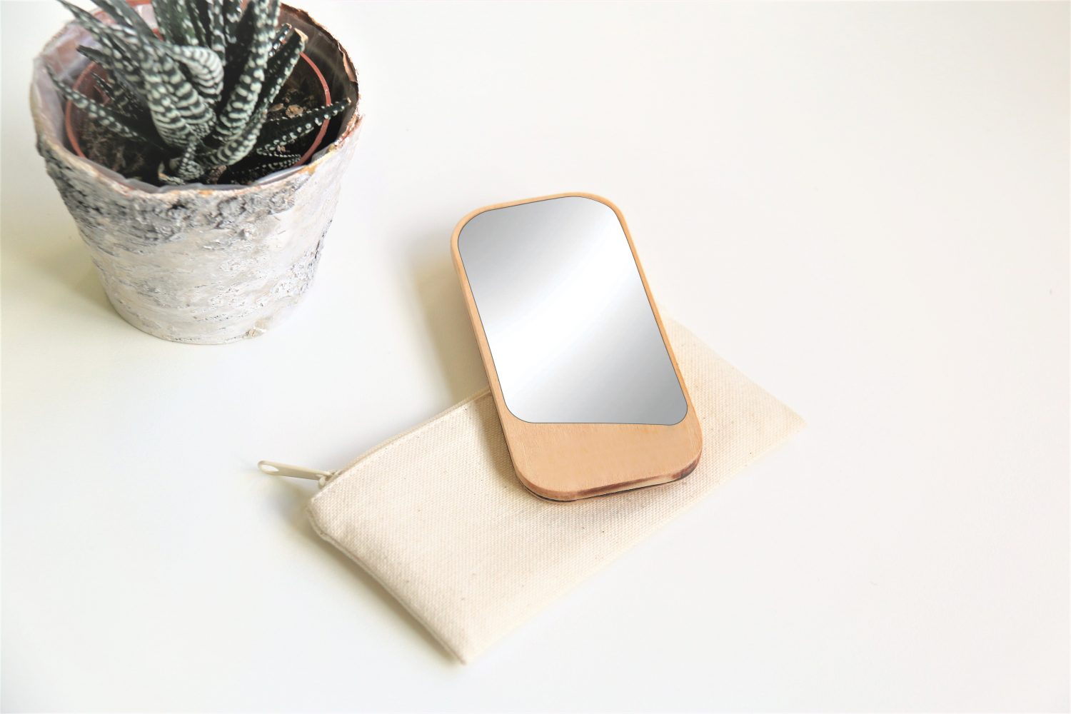 L’appareil à selfie low tech personnalisable : un joli miroir de poche en bois gravé dans sa trousse de tissu