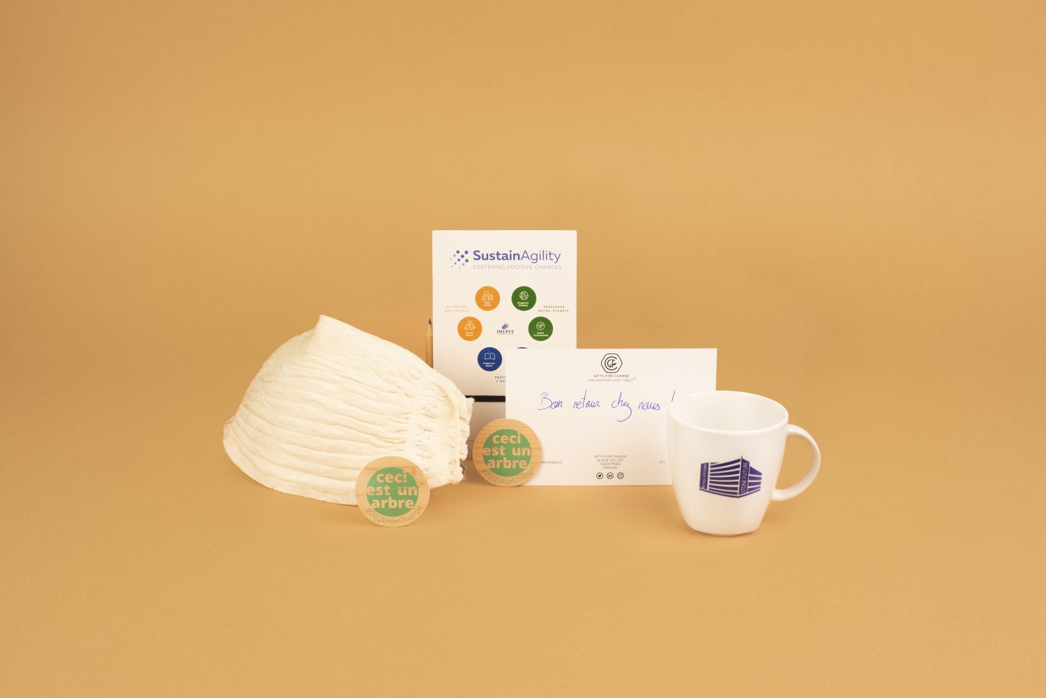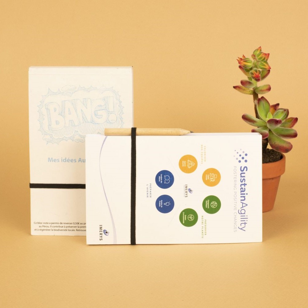 Kit d’accueil comprenant 1 bloc note avec crayon papier recyclé au format 105x170mm, relié par le haut avec 100 feuilles/200 pages vierges, 1 masque lavable UNS 1 et UNS 2 Grand Public de couleur écru, 1 mug personnalisé en 2 couleurs, 2 woodsticks imprimés et une carte imprimée 10×15 R/V en papier recyclé 300g
