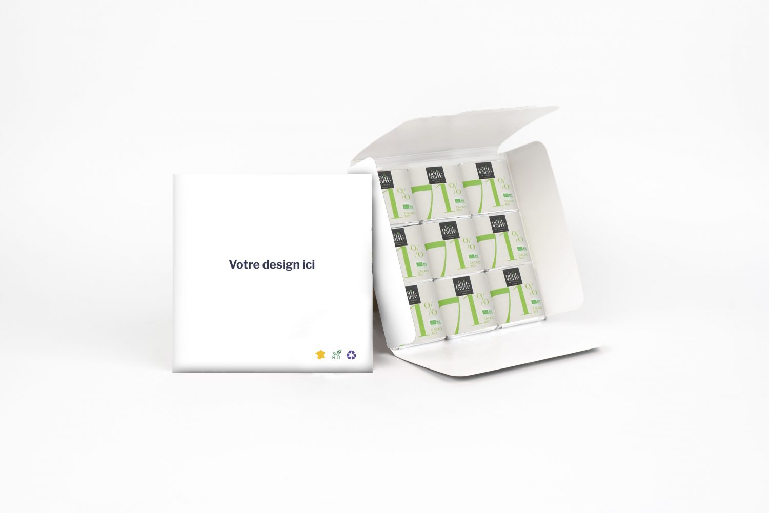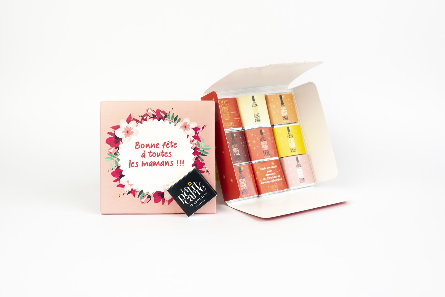 Personnalisée en impression quadri sur l’extérieure de la boite. L’emballage des carrés est standard.