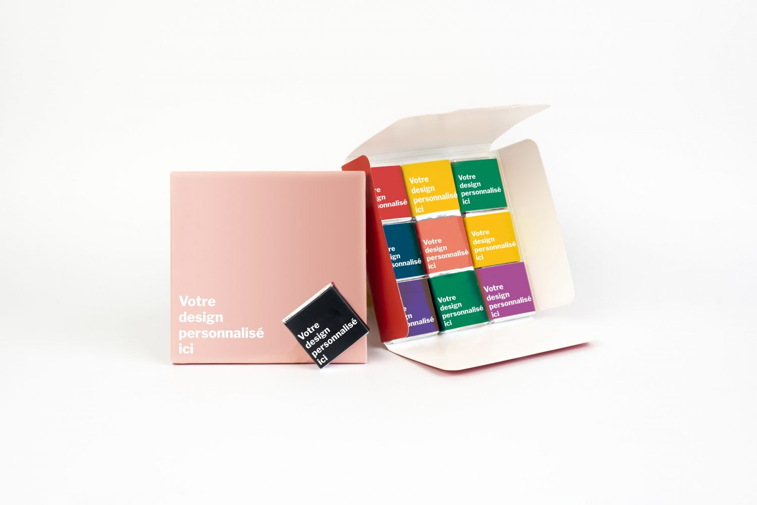 Personnalisée en impression quadri sur l’extérieure de la boite. Chaque carré est personnalisé différement par une impression quadrichromie sur la face extérieure.
