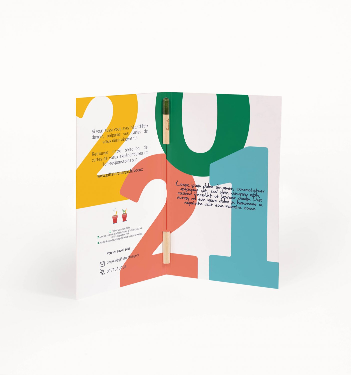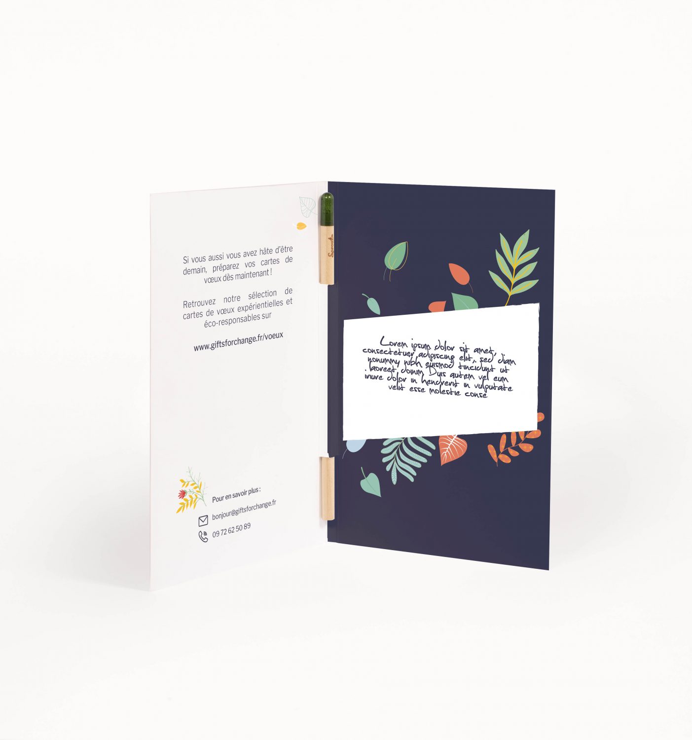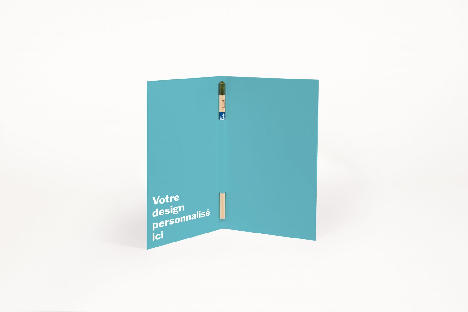 Carte imprimée en quadrichromie recto verso avec un crayon en bois avec plusieurs graines dedans. Choix des graines parmi la liste suivante : Basilic, Sauge, Thym, Tournesol, Tomate cerise et Myosotis. Format de la carte : 13.75 x 21.00 cm.
