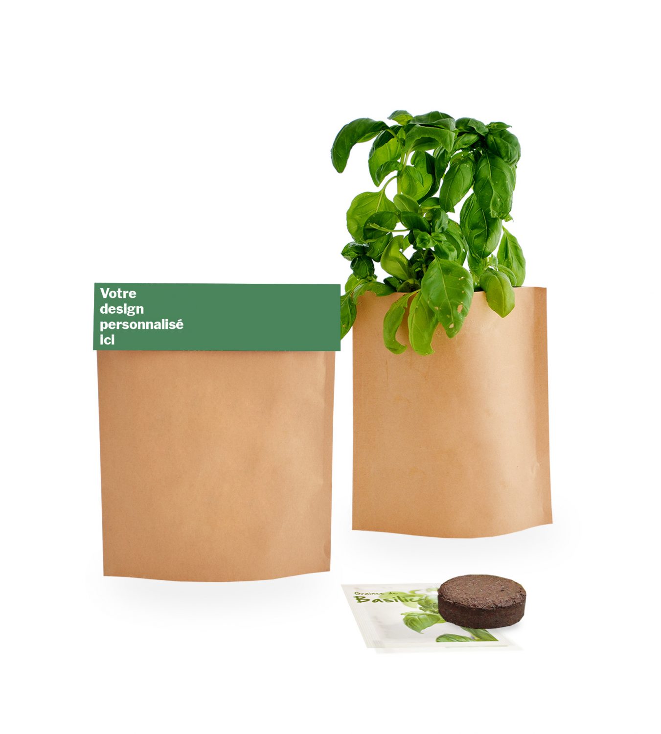 Kit de plantation en kraft contenant une plaquette de tourbe déshydratée et des graines européennes issues de l’agriculture raisonnée à choisir parmi les suivantes. Fleurs : Capucine, Tournesol, Centaurée, Physalis, mélange de fleurs sauvages ou mellifères. Aromatiques : Basilic, Ciboulette, Persil, Aneth, Thym, Mélange aromatique. Légumes : Radis, Carotte, Roquette, Cresson, Tomate cerise, Salade à coupe. Personnalisation du cavalier en quadrichromie recto sur une zone de 132×80 mm.
