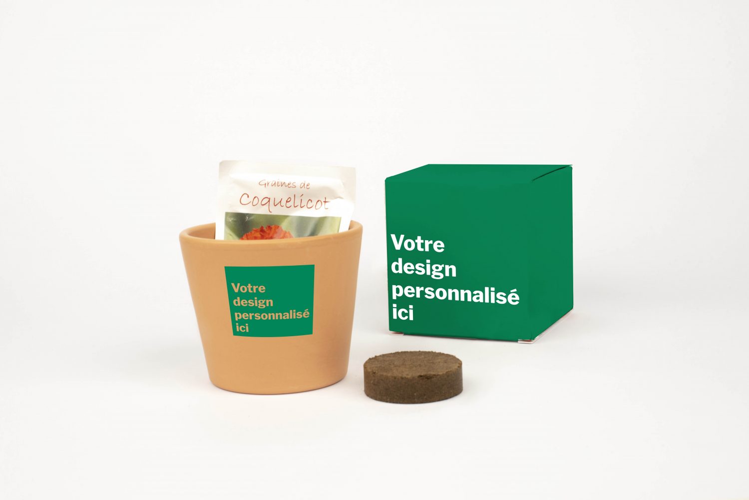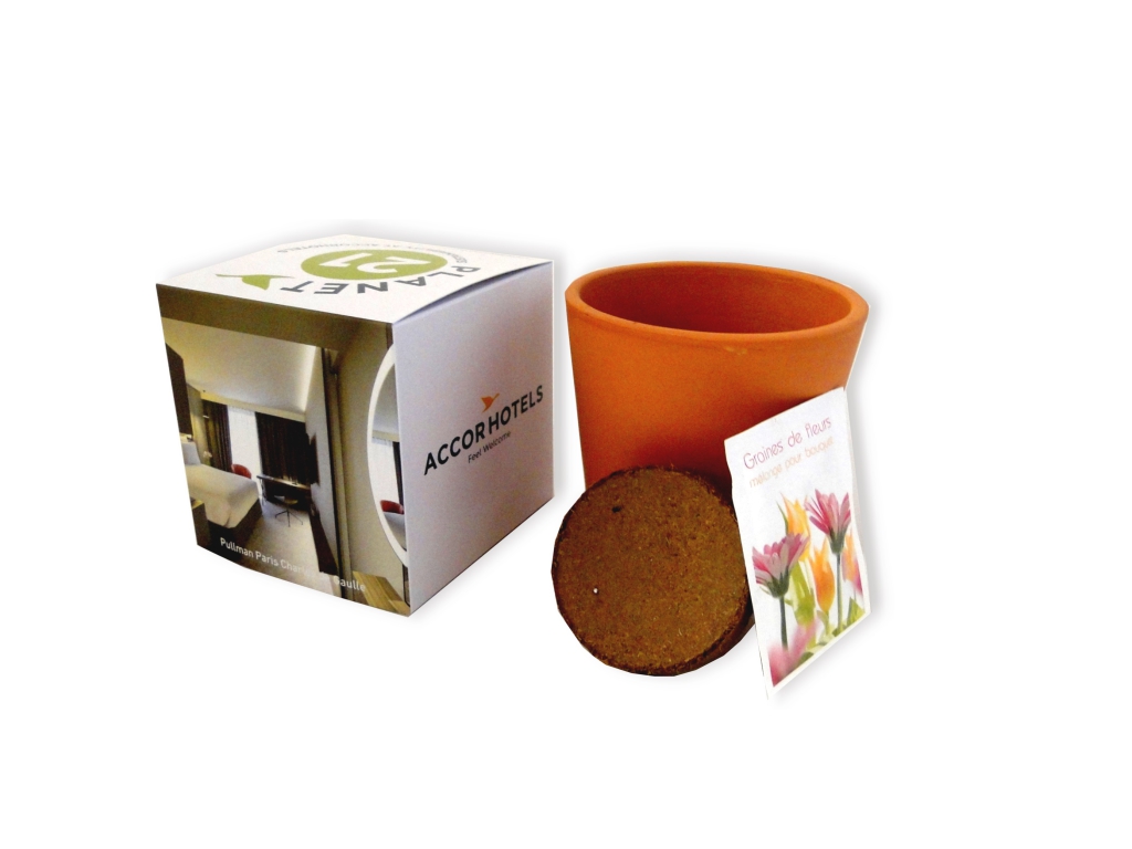 Kit de plantation en terre cuite contenant une plaquette de tourbe déshydratée et des graines européennes issues de l’agriculture raisonnée à choisir dans un pot sérigraphié une couleur. Graines à choisir parmi les suivantes. Fleurs : Capucine, Tournesol, Centaurée, Physalis, mélange de fleurs sauvages ou mellifères. Aromatiques : Basilic, Ciboulette,Persil, Aneth, Thym, Mélange aromatique. Légumes : Radis, Carotte, Roquette, Cresson, Tomate cerise, Salade à coupe.