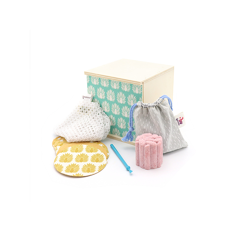 • 1 filet de lavage en coton bio • Coffret en bois de peuplier