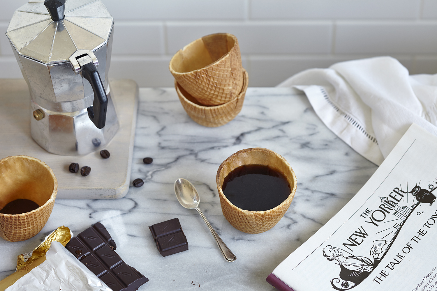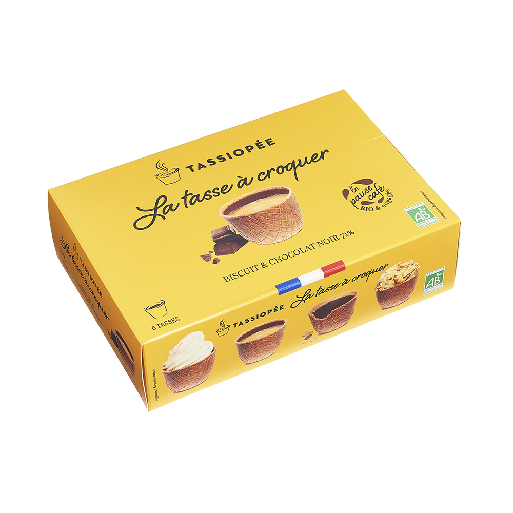 6 tasses bio et made in France réalisées en gaufre et recouvertes de chocolat à l’intérieur. Livrées dans une boite.